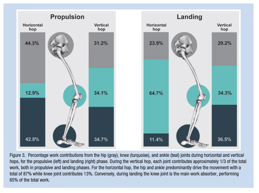Due to the nature of horizontal hop testing, they largely capture and assess the propulsion phase of hopping. We know that in the propulsion phase of horizontal hopping the hip, knee, and ankle contribute 44%, 12%, and 42%, respectively of the work. These limitations highlight the need for more robust evaluation tools that assess knee function comprehensively.